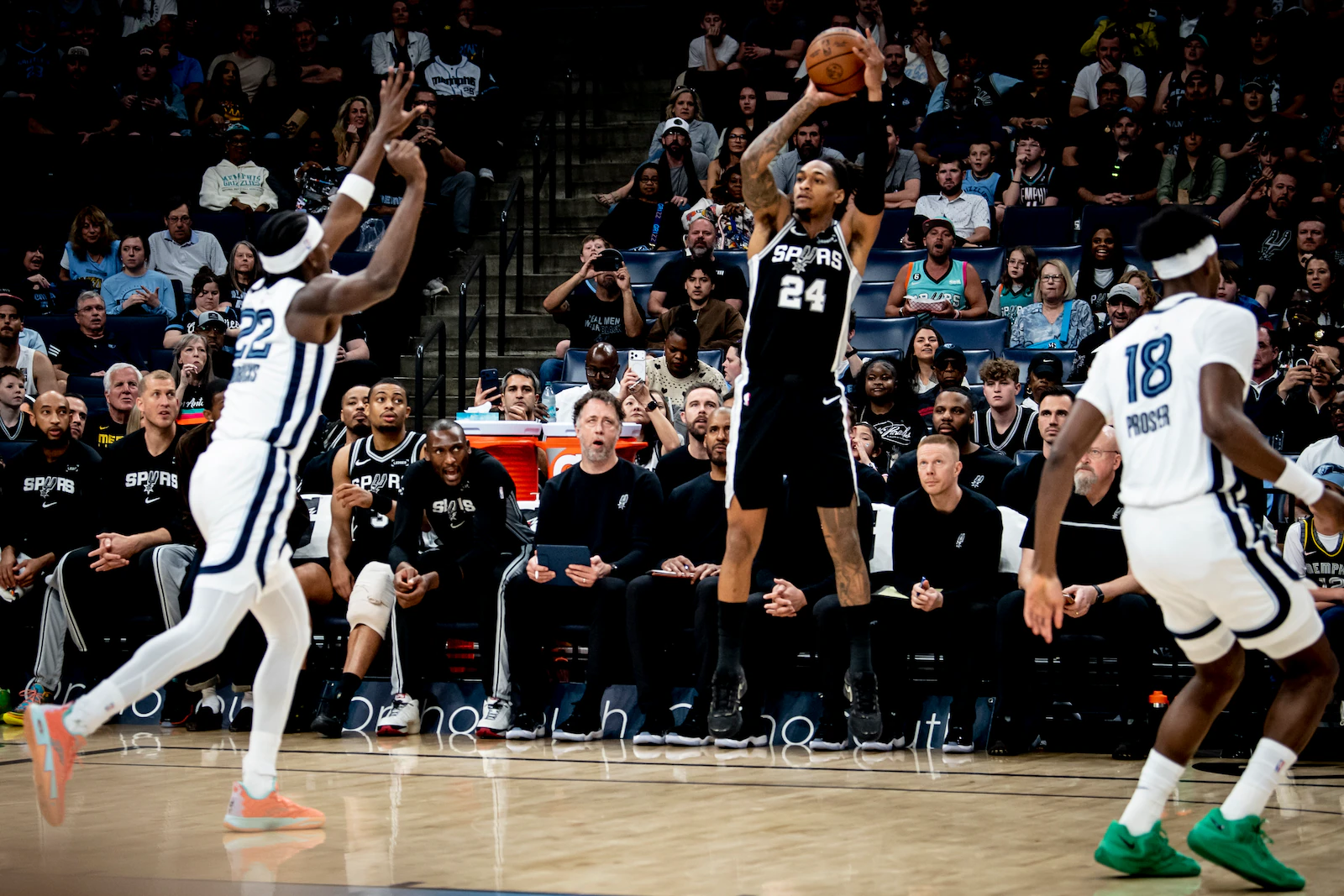 試合開始直後の1Q、スパーズのフォックスとヒートのヒーローによるガード陣の激しい攻防が中心となりました。両チームともオフェンスが好調で、クォーター中盤までに合計40得点以上を記録するハイペースな展開となります。スパーズはフォックスとハーパーのプレーメイクによって終盤にリードを広げましたが、ヒートもヤクチョニスの連続3ポイントで食い下がり、38-31で1Qを終えました。